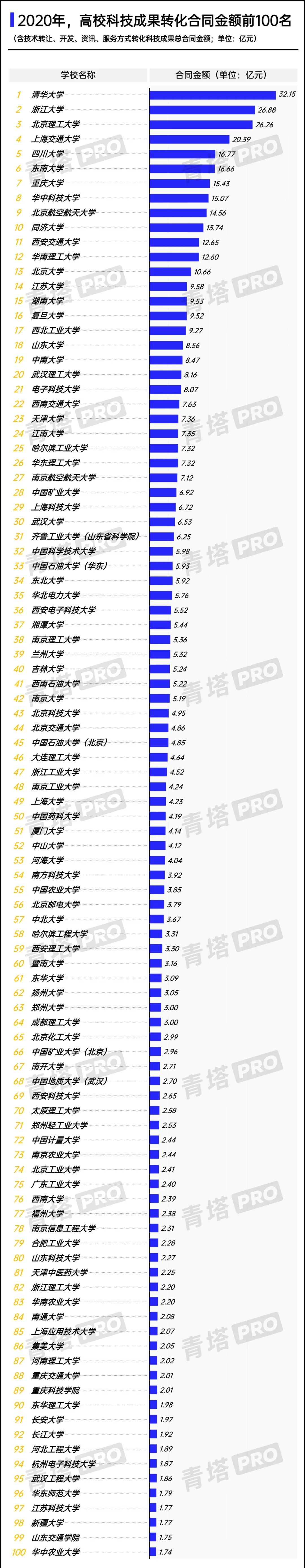 最新发布的《中国科技成果转化2021年度报告(高等院校与科研院所篇)》显示,2020年,全国共1433家高等院校的科技成果转化报告被纳入统计(中央部属高校101家;地方高校1332家),总合同数达22.19万项,总合同金额超过826.50亿元,较之2019年,增幅达17%。在2020年高校院所科技成果合同金额前100名榜单中,清华大学、浙江大学、北京理工大学分别以321470.56万元、268828.15万元、262630.54万元位列前3名。